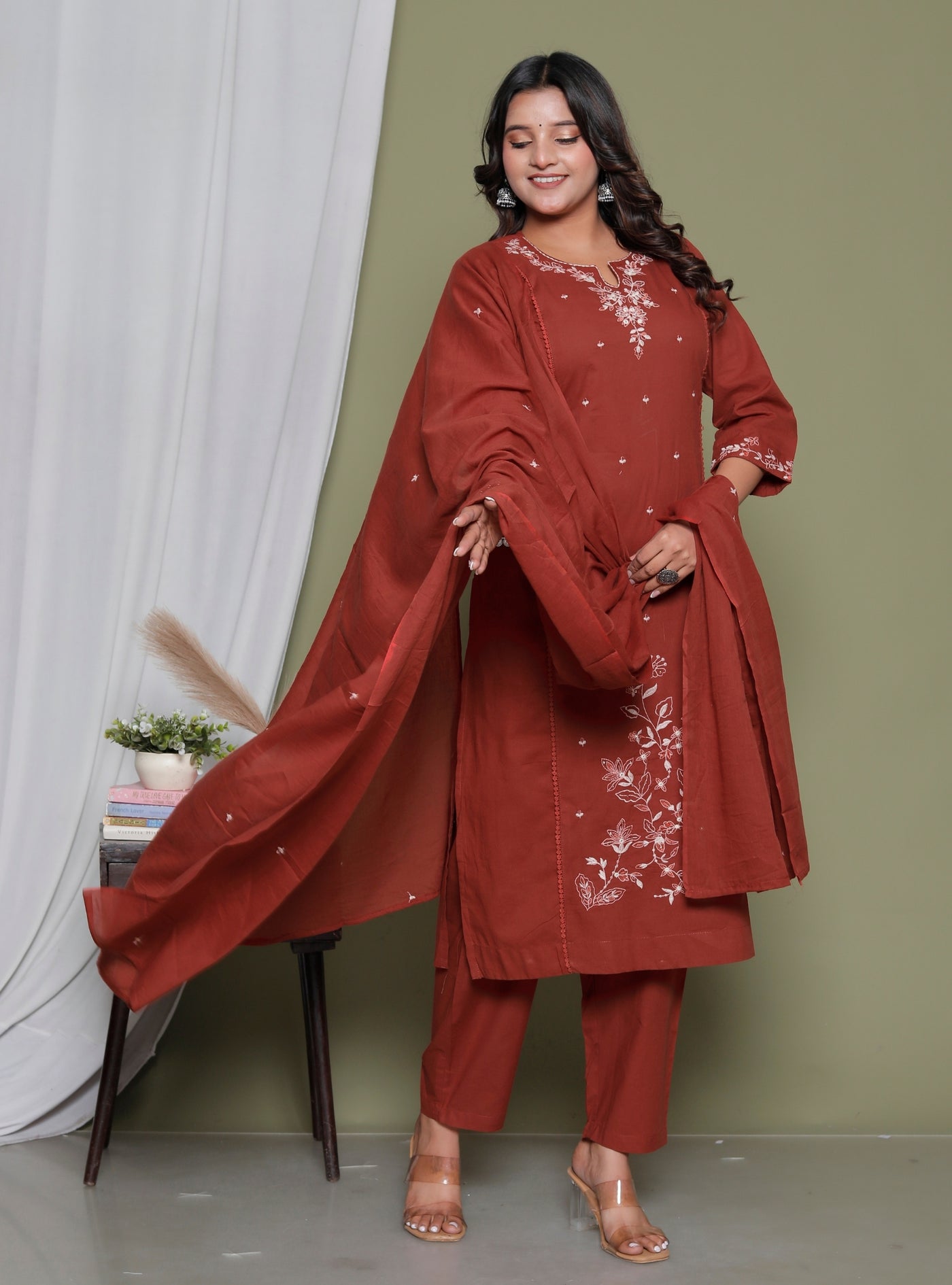 The Rust Embroidered Kurta Set with Dupatta from ZarikaJaipur is crafted in soft, breathable pure cotton, offering a perfect balance of comfort and elegance.